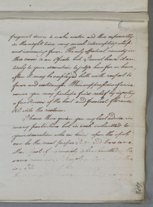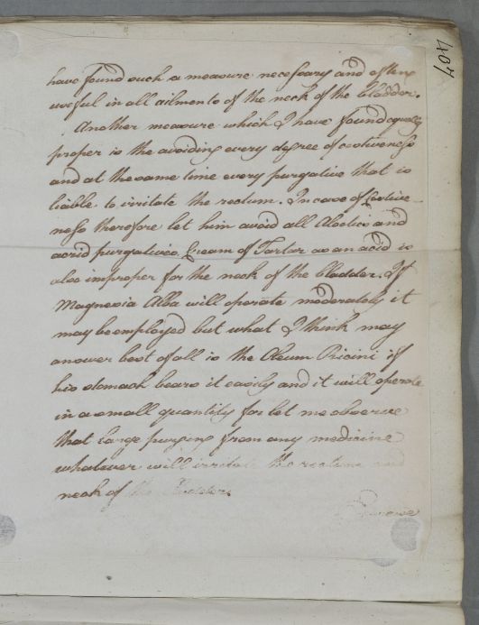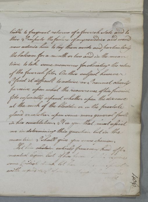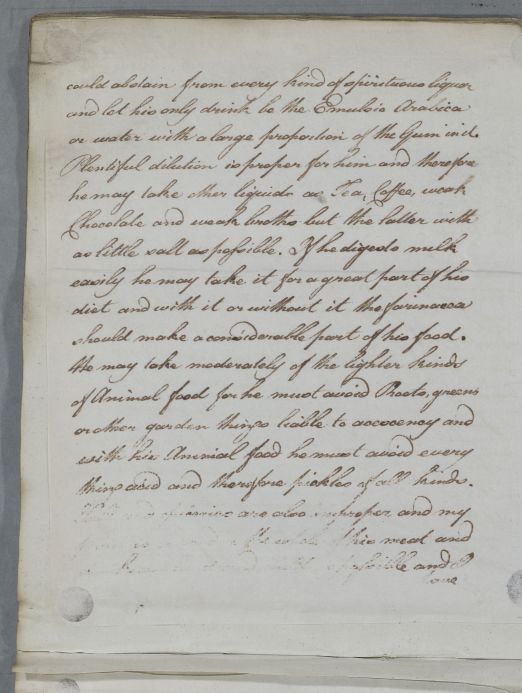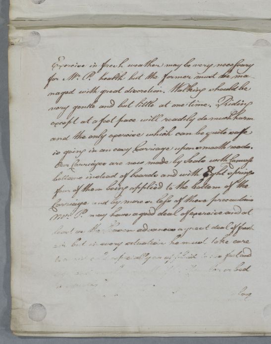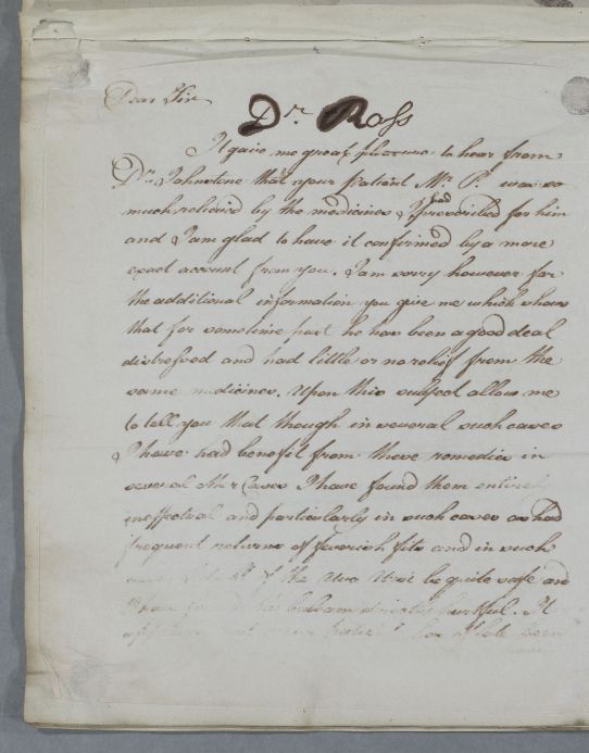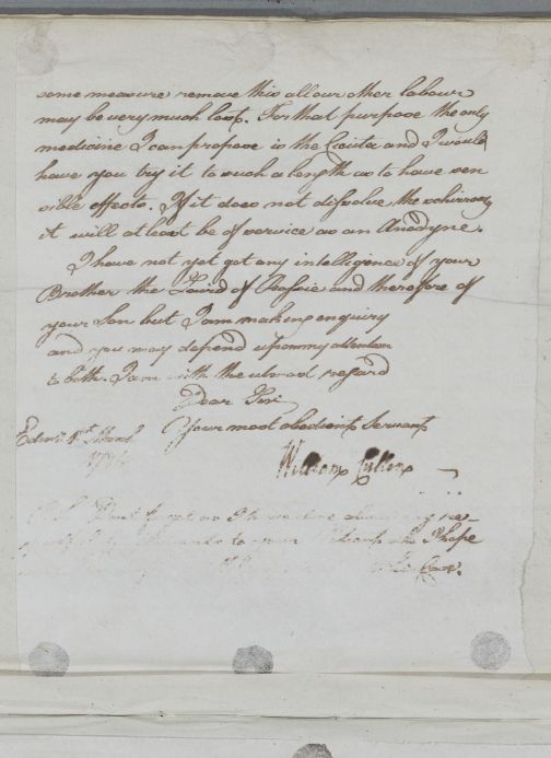 | Summary | Reply, 'Dr Ross'. Cullen says that he has heard from Dr Johnstone concerning 'your patient Mr. P.' (John Parish). He gives dietary advice and also advice on use of a carriage for exercise, describing the springing of carriages used in Britain (presumably different from that used in Germany). He now suspects 'a Schirrosity of the Prostate Gland near the neck of the Bladder' and advises the use of Cicuta. He tells Ross he has not yet had any news regarding his son or his brother, Hercules Ross of Rossie. |