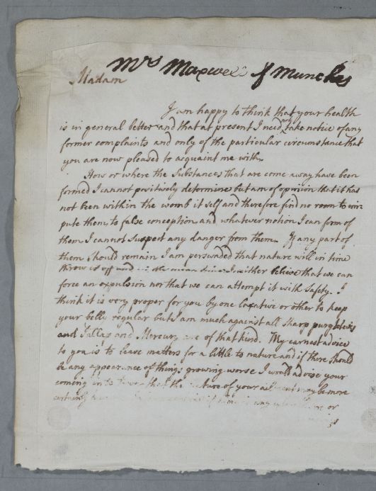 Case of Mrs Maxwell of Munches [Munchies] whose symptoms are attributed to 'a weakness of the womb'; she is later considered a 'nervous' case. Cullen's replies refer to a number of incoming letters which are untraced. |