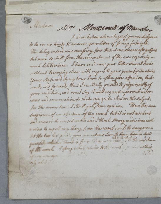 Case of Mrs Maxwell of Munches [Munchies] whose symptoms are attributed to 'a weakness of the womb'; she is later considered a 'nervous' case. Cullen's replies refer to a number of incoming letters which are untraced. |