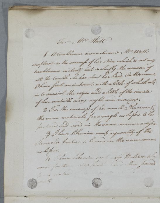 Reply, 'For Mrs Watt'. A brief note, probably to her relative, Mr Brown, outlining what Cullen has sent to her in the way of ointments, gargles, stomachics, and a little dietary advice.