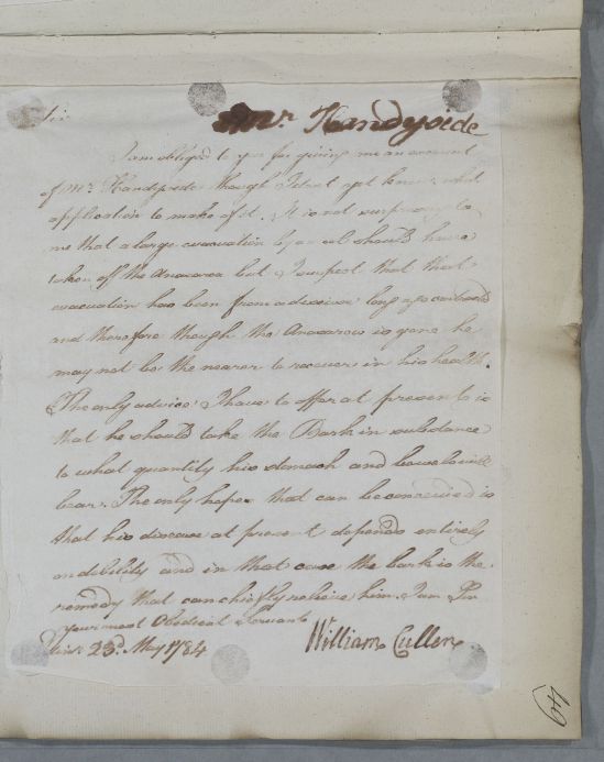 [ID:4836] From: Dr William Cullen (Professor Cullen) / To: Mr William Cokayne (Cocayne) / Regarding: Mr Handasyde (Handyside) (Patient) / 23 May 1784 / (Outgoing)