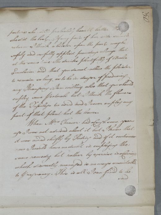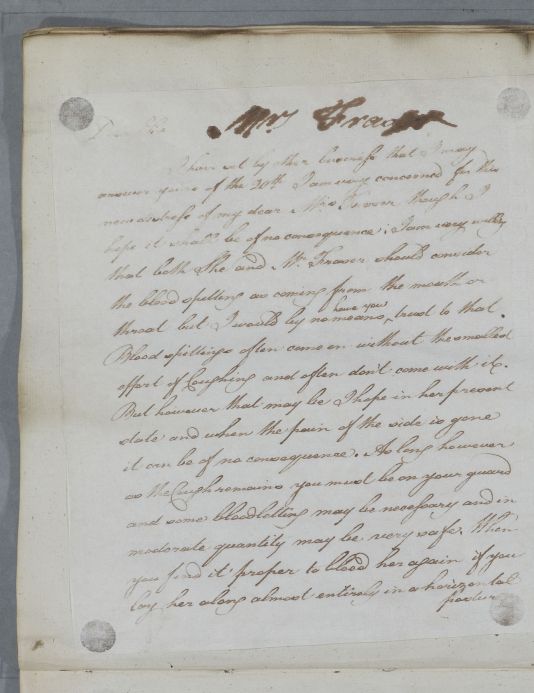| Summary | Reply, for 'Mrs. Fraser'. Addressed to an unknown male physician (likely John Alves). Cullen advises on bloodletting, on blistering the side should the pain there increase, on pectoral medicines and exercise. |