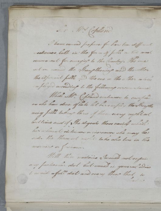 Case of Mrs Copland who is prescribed an aperient and a strengthening pill to take with her to the country. |