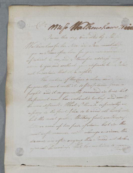 Reply concerning the case of Miss Walkinshaw's niece. Cullen says he was consulted by Miss Walkinshaw for the patient the day of writing the letter.