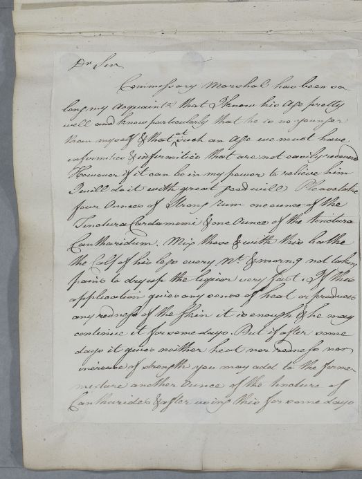 Reply to John Jamieson concerning the case of Commissary Marshall, pp.75. Cullen advises the use of Cardamom and Cantharides for bathing his legs, but notes that 'he is no younger than myself & that at such an age we must have infirmities & infirmities that are not easily recovered'.