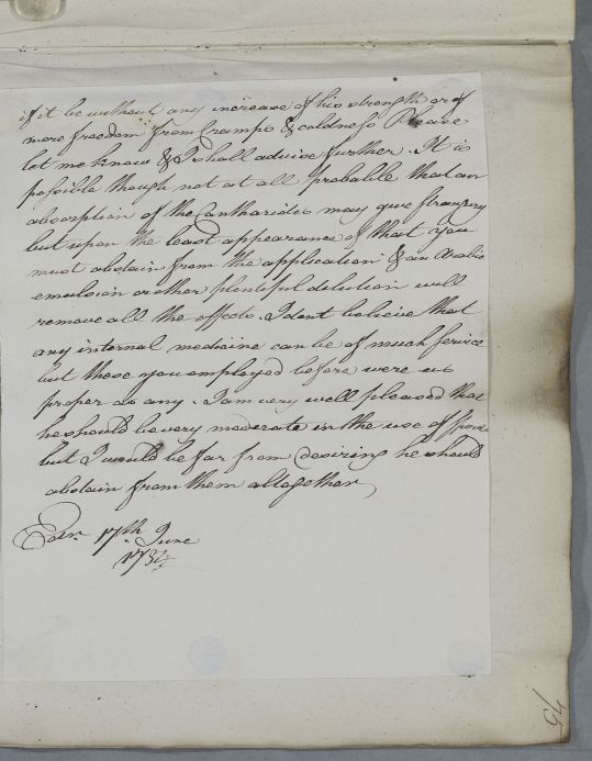 | Summary | Reply to John Jamieson concerning the case of Commissary Marshall, pp.75. Cullen advises the use of Cardamom and Cantharides for bathing his legs, but notes that 'he is no younger than myself & that at such an age we must have infirmities & infirmities that are not easily recovered'. |