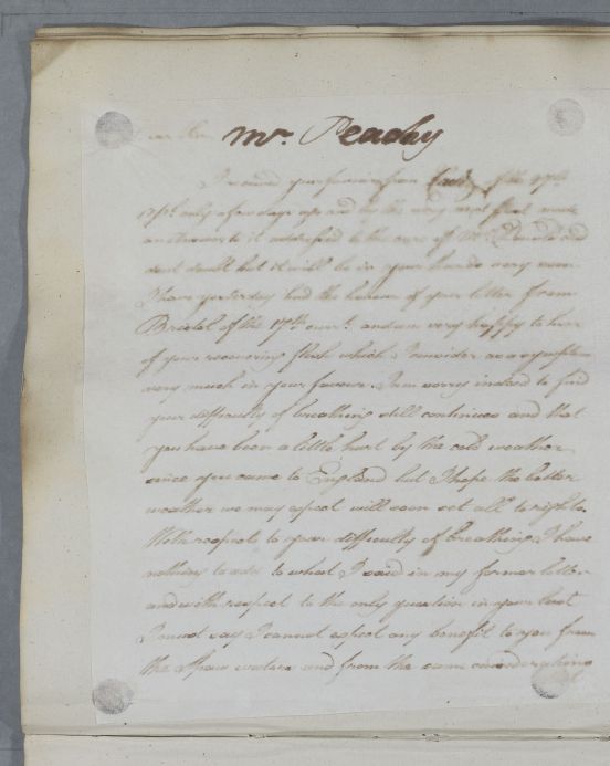 Case of John Taylor Peachy who is about to sail for London from Cadiz, where his cough cleared up but who is still breathless. |