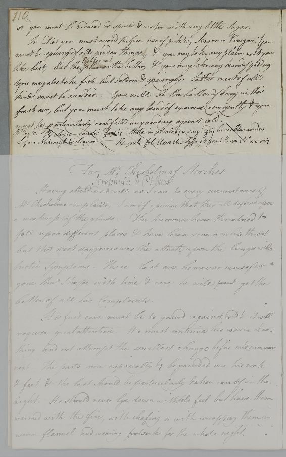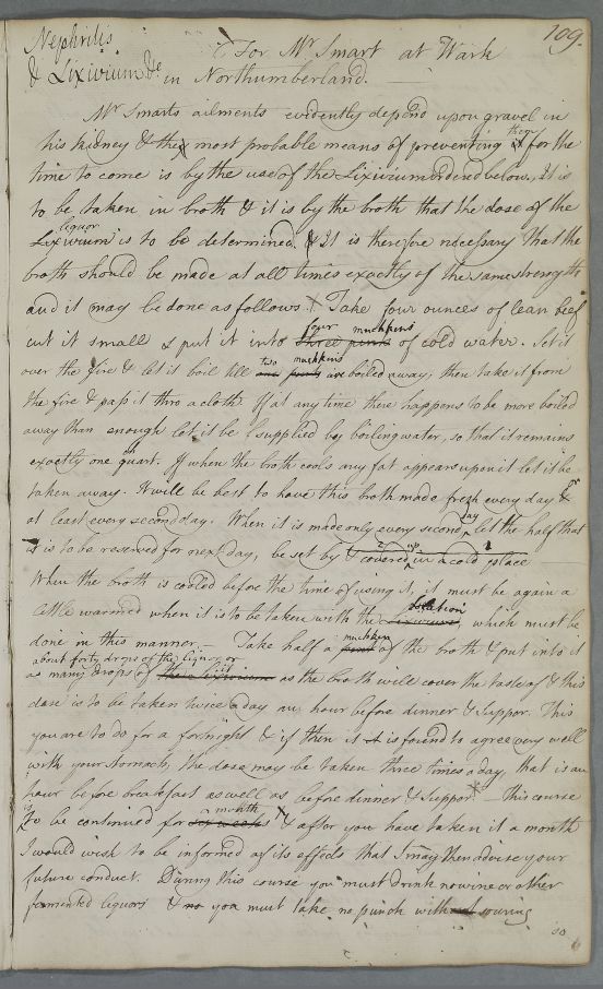 | Summary | Reply 'For Mr Smart at Wark in Northumberland', giving details on how to make a beef broth to disguise the taste of a course of Lixivium being prescribed to treat gravel. Followed by two deleted recipes which may be unconnected, being prescribed for a 'Mr Taylor'. |