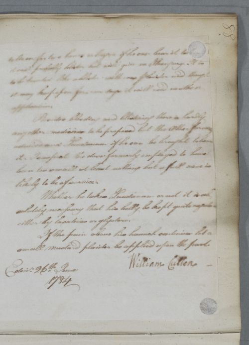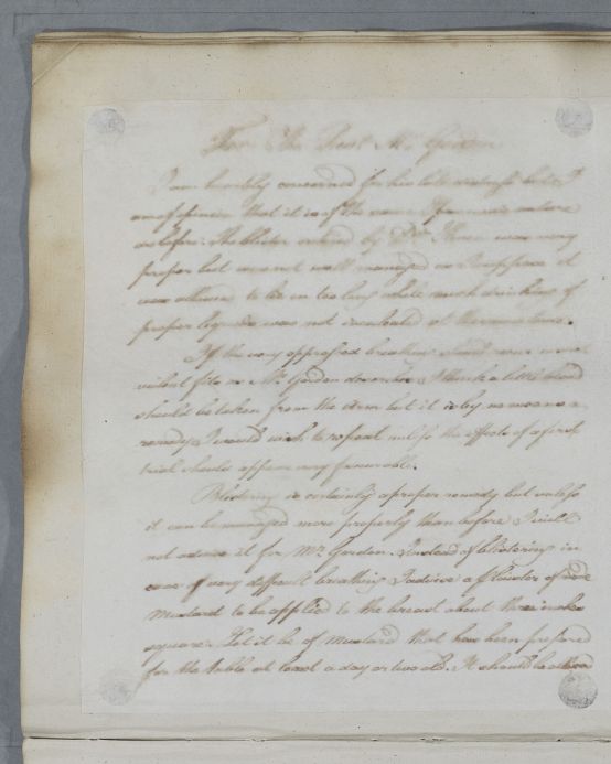 | Summary | Reply, 'For the Revd. Mr. Gordon'. Cullen provides detailed management for the application of a blister to combat the effects of the patient's chest complaint, which Cullen describes as being of a spasmodic nature. |