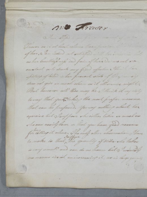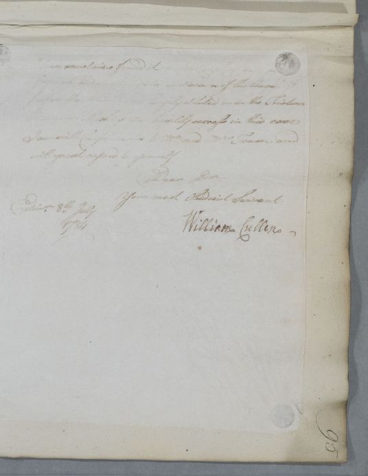 | Summary | Reply, for 'Mrs Fraser'. Cullen advises on monitoring the quantity of nitre taken by Mrs Fraser and would prefer she take vitriolic acid. He does not think her breathlessness and pain of her side denotes 'any fixed affection'. |