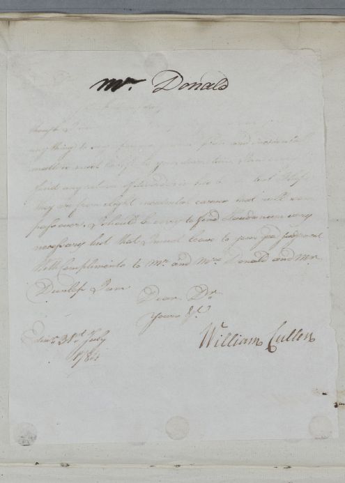 | Summary | Reply, for 'Mr Donald'. Cullen is sorry to hear of the return of Mr Donald's disorder, but leaves 'incidental matters' to Stevenson's discretion. Parts of the letter are illegible due to a poor copy. |