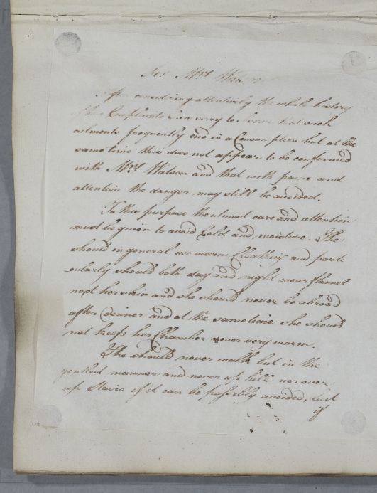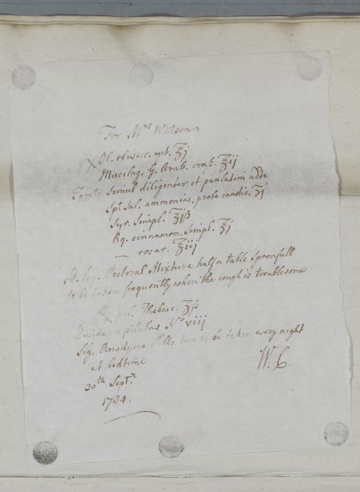 | Summary | Reply concerning the case of Mrs Watson, probably to her husband: ' such ailments frequently end in a Consumption', but Cullen believes it may be averted by wearing flannel, avoiding exertion (even going upstairs), and diet. He encloses prescriptions in his own hand for a pectoral mixture and anodyne pills. |