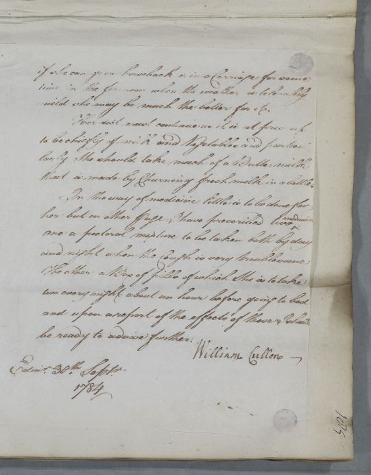 [ID:4925] From: Dr William Cullen (Professor Cullen) / To: Mr Robert Watson / Regarding: Mrs Watson (Patient) / 30 September 1784 / (Outgoing)