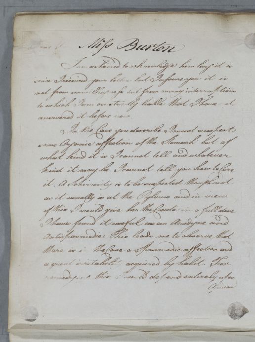 Reply, for 'Miss Burton'. This letter is addressed to Richard Worthington, concerning the case of Miss Burton, who has a gastric complaint. Cullen says that 'A Schirrosity is to be suspected though not as it usually is at the Pylorus'. He recommends the use of opium by glyster and cicuta by mouth.