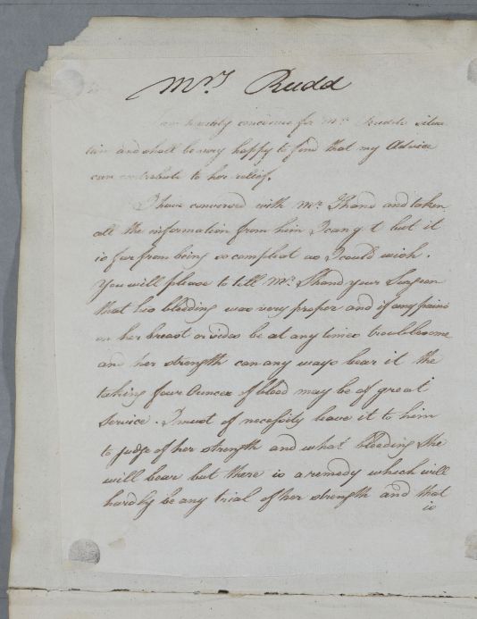 [ID:4936] From: Dr William Cullen (Professor Cullen) / To: Reverend James Rudd / Regarding: Mrs Elizabeth Rudd (Sutherland) (Patient) / 23 October 1784 / (Outgoing)