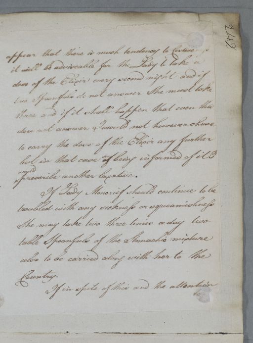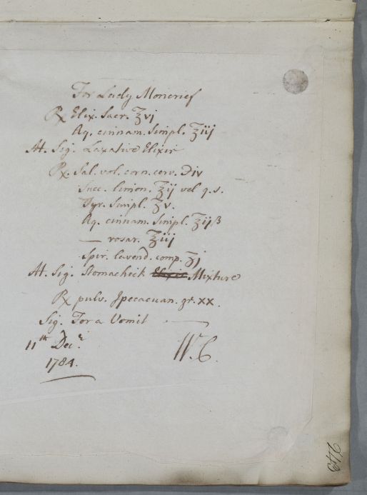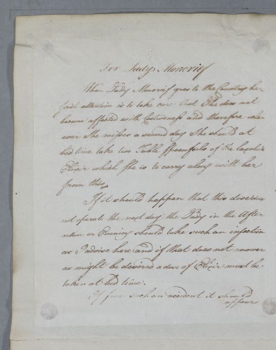 Case of Lady Moncrief who has suffered from 'sickness and squemishness' and who is going to the country where she must guard against being costive. |