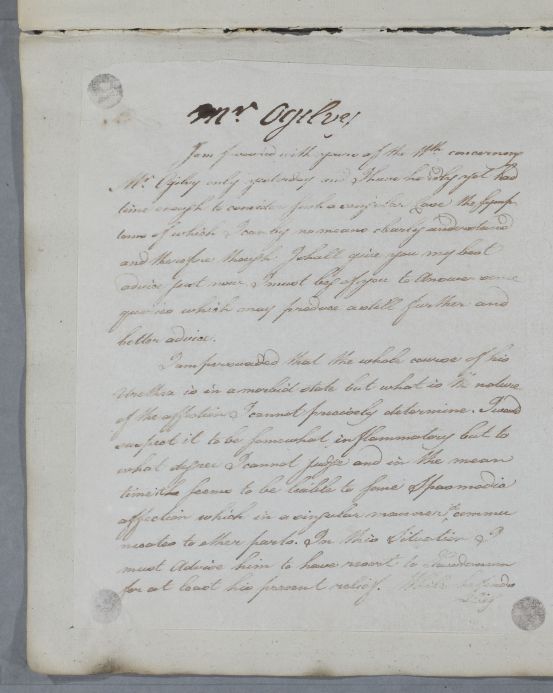 [ID:4985] From: Dr William Cullen (Professor Cullen) / To: Mr George French / Regarding: Reverend George Ogilvy (of Banchory-Devenick) (Patient) / 15? February 1785 / (Outgoing)