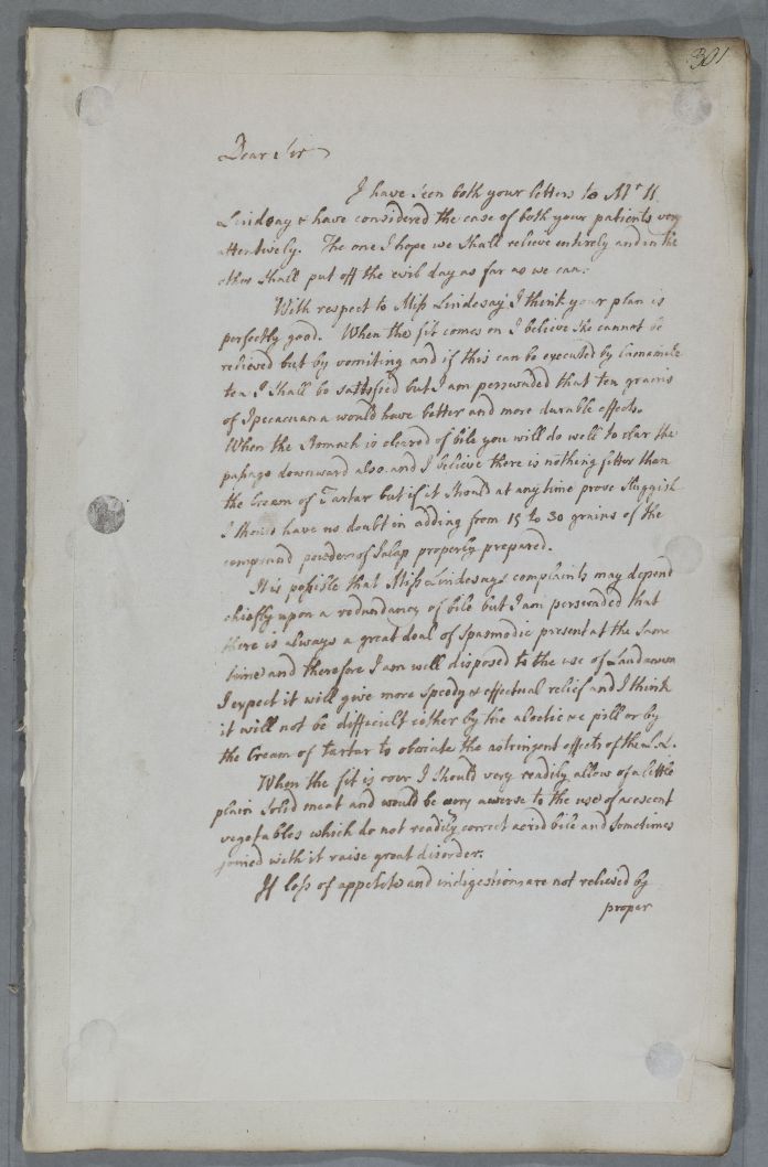 Case of Miss Lindsey [Lindesay] who has responded badly to an electuary Cullen prescribed earlier. |