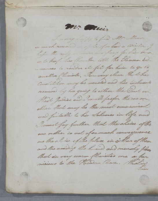 | Summary | Reply, 'Mr Muir'; Cullen is pleased to find him 'so much recovered after so bad a winter'. |