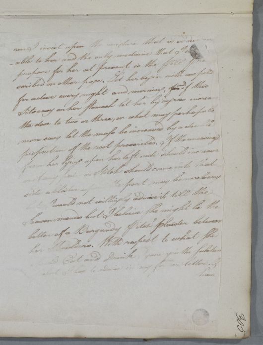 Case of Mrs McKie, who in 1781 has had a miscarriage. Correspondence resumes in January 1785 over her cold and cough. |