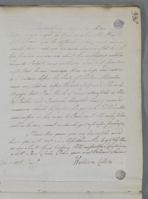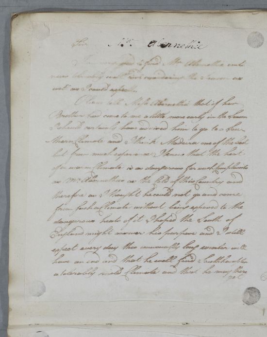 | Summary | Reply to John Stewart concerning the case of Mr. Abernethie, suggesting a possible voyage to Lisbon from Falmouth for him and his sister, since it is too late in the year to go to Madeira. |