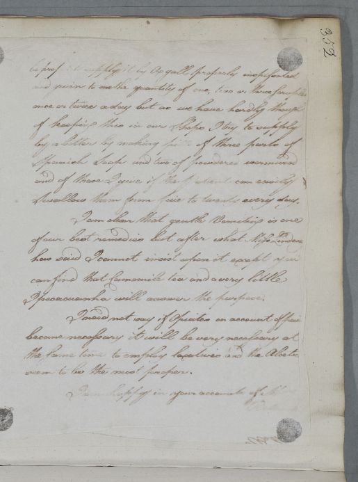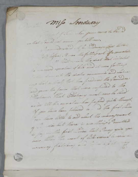 Case of Mrs Anne Bethune of Balfour and Kilconquhar, who in 1783 has largely recovered from a recent disorder but needs to take precautions, but by 1785 she has a bleeding wound on her breast. Goodsir and Cullen discuss dressing it. |