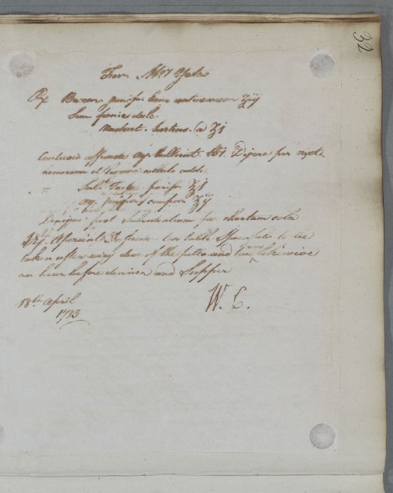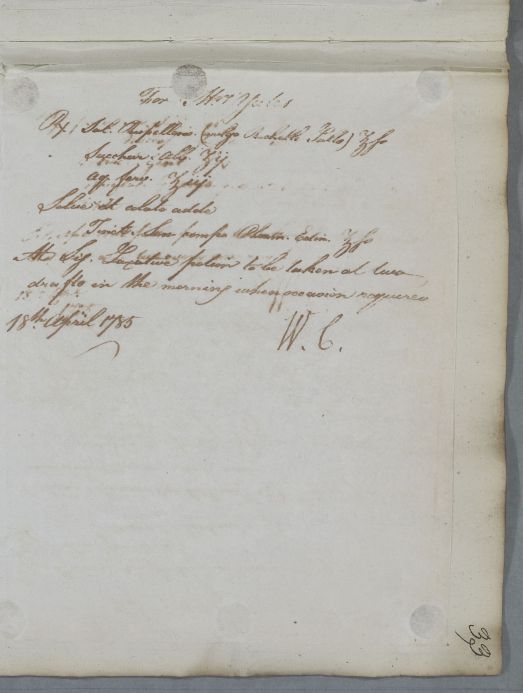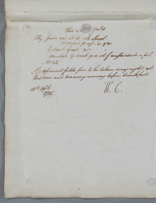 [ID:5034] From: Dr William Cullen (Professor Cullen) / To: Dr / Regarding: Mrs Yates (Patient) / 18 April 1785 / (Outgoing)