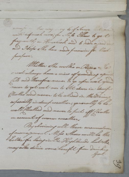 Reply 'For Miss Shaw'. Advice for a lady or girl who is to spend the summer taking a goat whey cure in the Highlands. Date inferred from place in casebook. No incoming letter, so possibly a personal consultation; no firm identification possible.