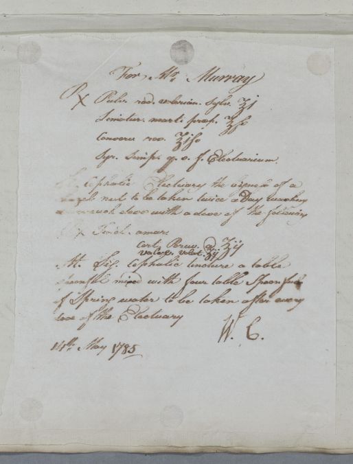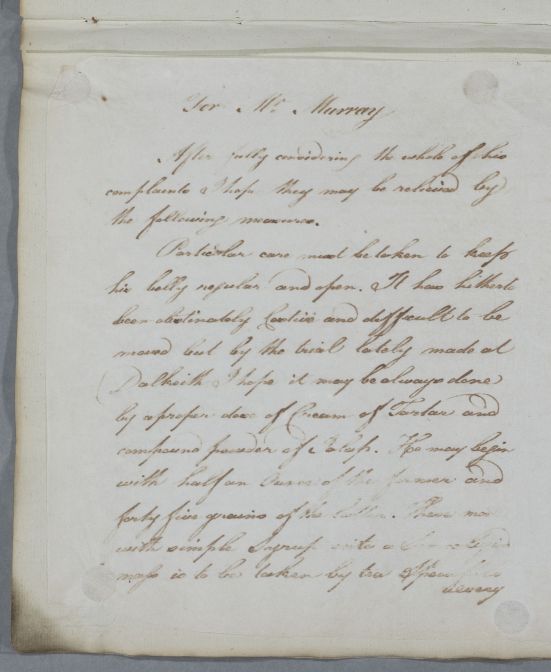 | Summary | Letter concerning the case of Mr Murray, which mentions him taking a curse of medicines at Dalkeith. Cullen mentions a trial of medicines "lately made at Dalkeith" which may relieve the "obstinately Costive" condition. |