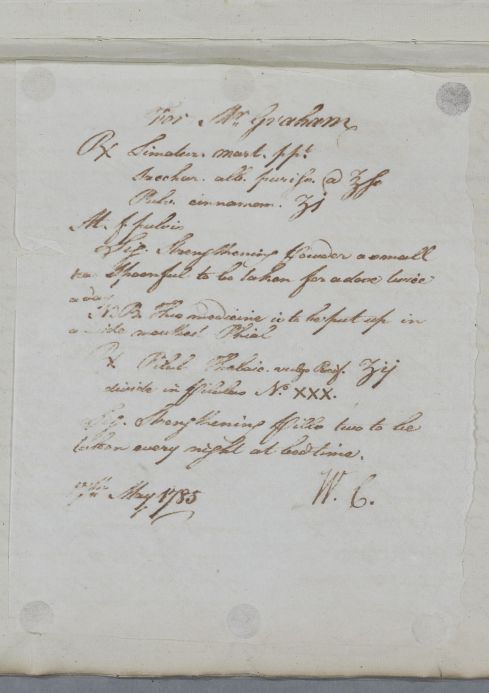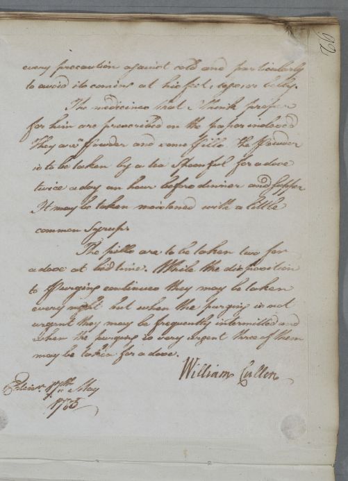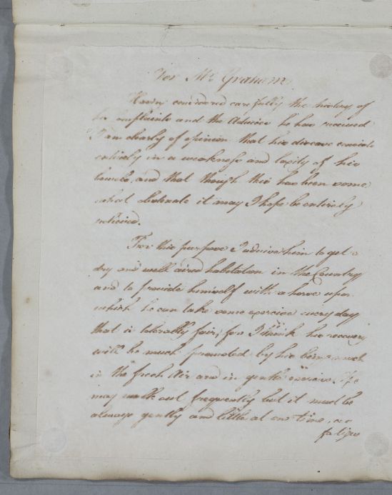 | Summary | Reply 'For Mr Graham', who suffers from purging, which Cullen ascribes to weakness and laxity in the bowels. Dietary advice and prescriptions are included. He has previously been treated by a Dr Farquharson. Possibly to John Taylor in Falkirk, who is later involved in the case. |