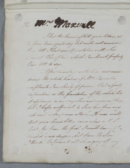 Reply, 'For Mrs Maxwell'. Cullen is 'of opinion that a Gouty disposition is the foundation of the whole [her various ailments]' and prescribes a diaphoretic solution, the recipe for which is enclosed. This letter appears to be addressed, more generally, to an unknown physician. In letter 6292, however, Cullen addresses John Gilchrist and states he 'had not the smallest hint of your being concerned in the Case otherwise I should have addressed himself more particularly to you' in prior correspondence.
