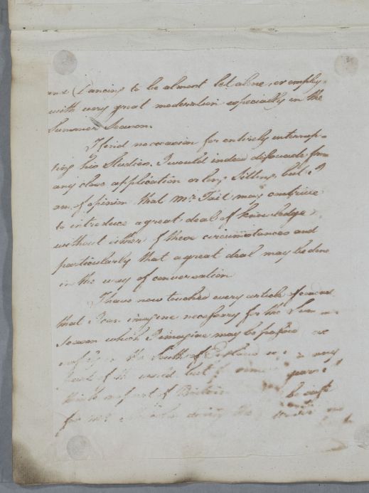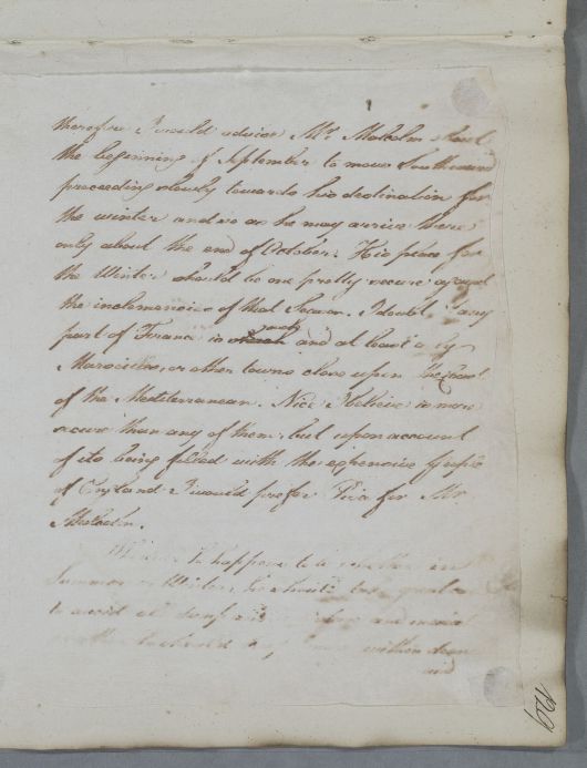 | Summary | Unidentified pages of a letter; however, they probably belong to the previous letter (document 5075) as they discuss young Mr Malcolm. Mentions studies with a Mr Tait, and recommendations for where in Europe the patient should spend the winter: 'upon account of [Nice] being filled with the expensive People of England I would prefer Piza for Mr. Malcolm.' Final page(s) missing. |