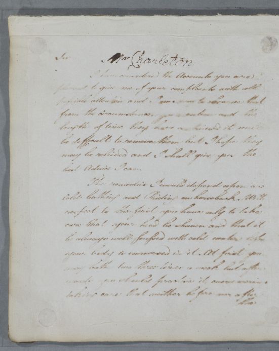 Case of the Reverend Charles Charleton who is advised to try cold bathing and a regimen for his persistent nose bleeds and painful spasms in his stomach. |