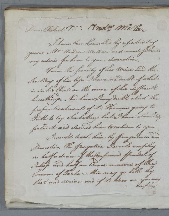 Letter to a physician named Robert concerning the case of Mr Andrew Millar.