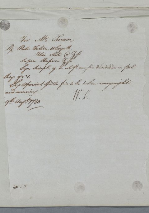 [ID:5119] From: Dr William Cullen (Professor Cullen) / To: [ADDRESSEE UNKNOWN] / Regarding: Mr George Swan (Patient) / 7 August 1785 / (Outgoing)