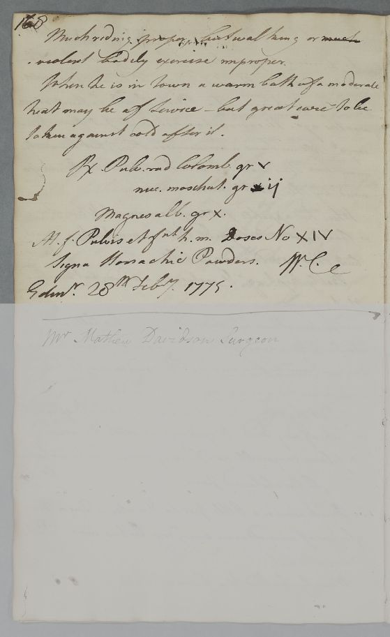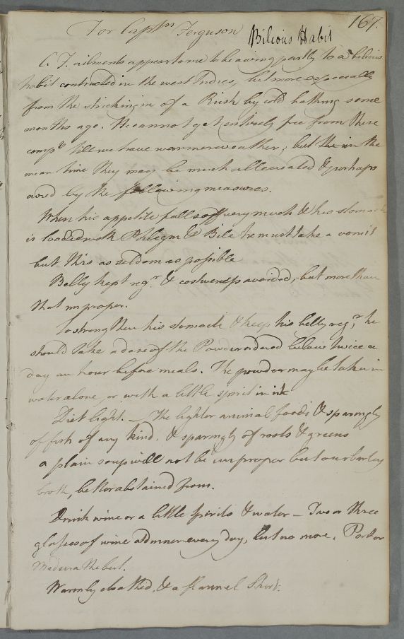 Reply 'For Captn. [Patrick] Ferguson', with advice and a prescription for his digestive/bilious problems, which Cullen believes derive from his service in the West Indies. Probably given to the patient in person.