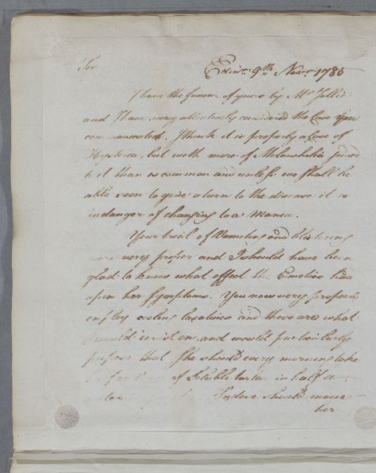 [ID:5170] From: Dr William Cullen (Professor Cullen) / To: Dr Alexander Browne / Regarding: Miss (Patient) / 9 November 1785 / (Outgoing)