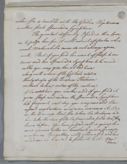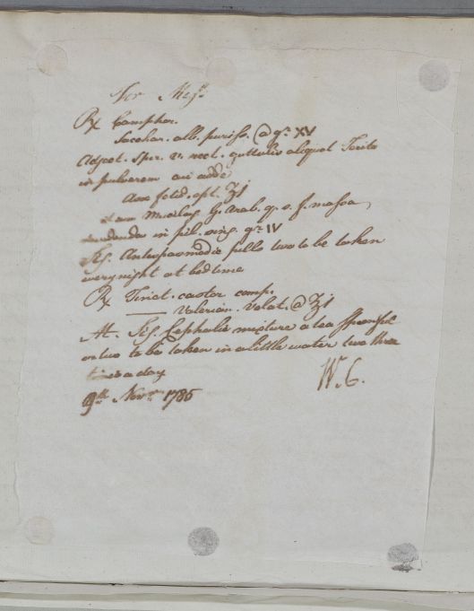 | Summary | Letter described in the index as 'Case of a Lady communicated by Mr Alexr. Brown'; letter begins with 'I have the favour of yours by Mr Jollie', and the recipe is headed 'For Miss'. |