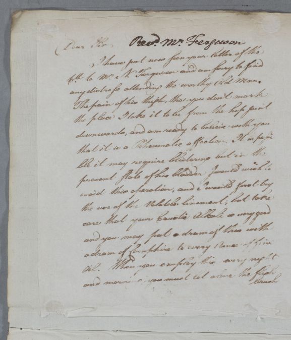 | Summary | Reply concerning the case of the Reverend Mr. Ferguson, who has a painful thigh. |