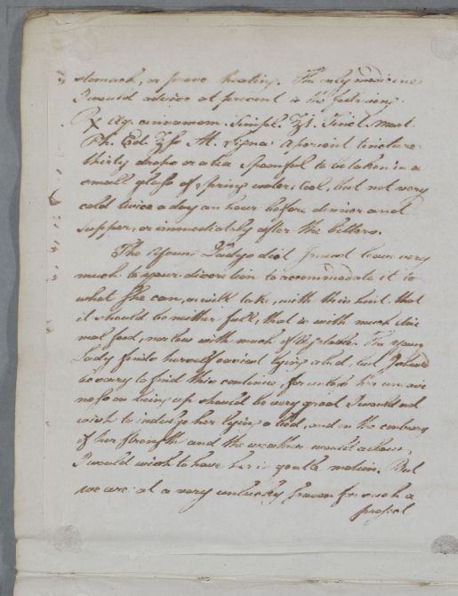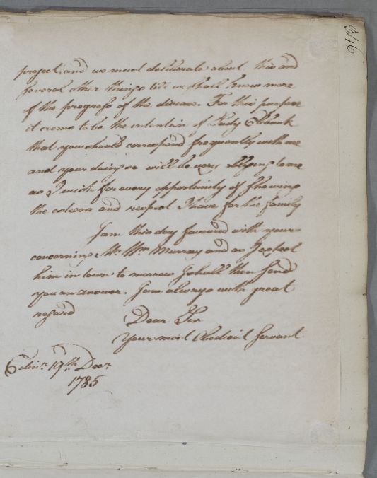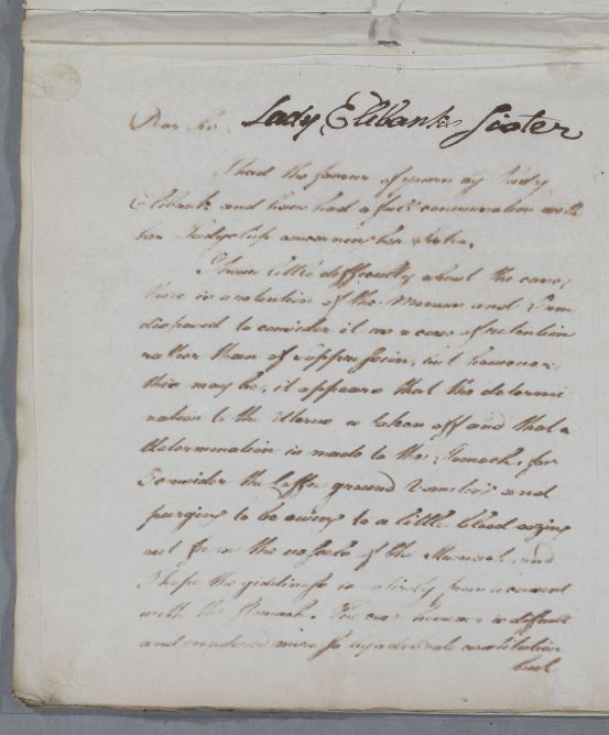 | Summary | Reply concerning Lady Elibank's sister (either Anne or Elizabeth Montolieu), who is suffering from a retention, rather than a suppression of the menses, and 'coffee ground' vomiting and purging. Cullen tells the addressee that 'I had the favour of yours by Lady Elibank'. He also mentions that William Murray is expected 'in town'. |