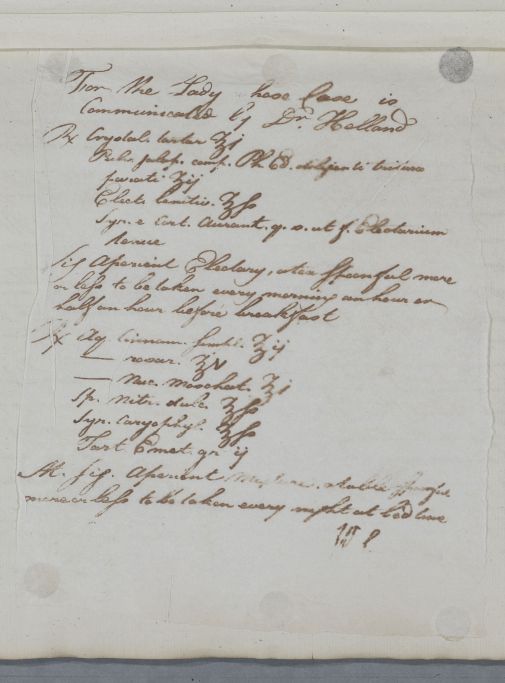 Case of an unnamed female patient who has a long history of being inactive, anxious and beset by various ailments, including swollen legs, an eruption on her face and other complaints as reported by Dr Holland. She has visited various English spas. |