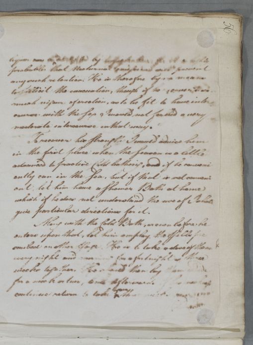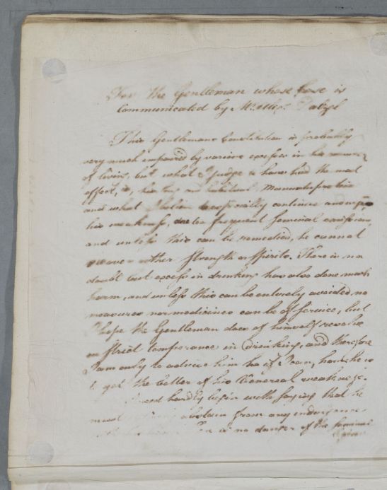 Reply headed 'For the Gentleman whose Case is communicated by Mr. Alexr. Dalzel' (spelt 'Dalzell' on the recipe and 'Dalziel' in the index), The patient suffers from seminal weakness, which Cullen ascribes to various excesses, especially his 'long and habitual manustuprations' (masturbation) and drinking. Temperance and cold bathing, whether in the sea or the use of the cold shower are recommended. Some words are illegible because of blurred copying.