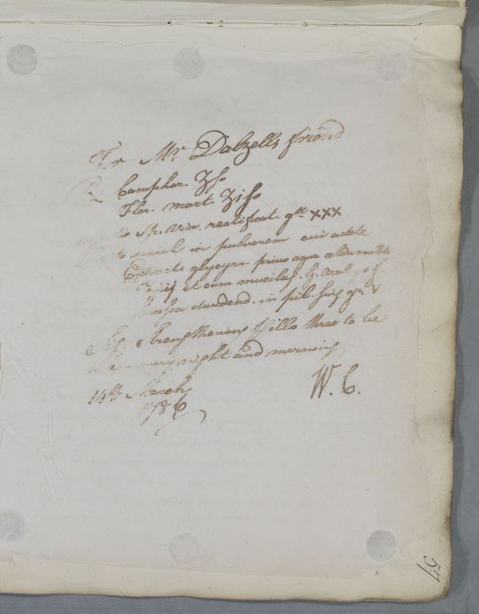 | Summary | Reply headed 'For the Gentleman whose Case is communicated by Mr. Alexr. Dalzel' (spelt 'Dalzell' on the recipe and 'Dalziel' in the index), The patient suffers from seminal weakness, which Cullen ascribes to various excesses, especially his 'long and habitual manustuprations' (masturbation) and drinking. Temperance and cold bathing, whether in the sea or the use of the cold shower are recommended. Some words are illegible because of blurred copying. |