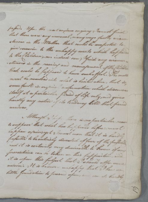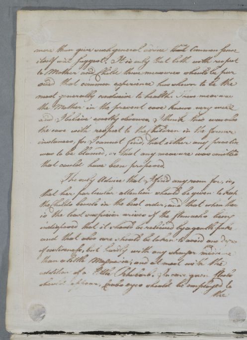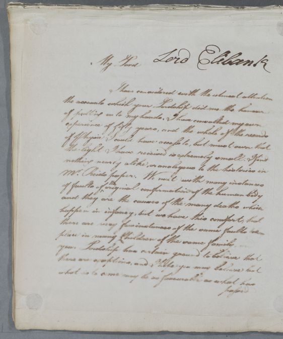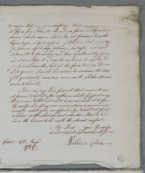 Letter to Alexander Murray, 7th Baron Elibank, concerning fears about infant health, after Cullen has read Mr Reid's account of the last illnesses and autopsies of his three dead babies (Charles, Clara and Gideon). He tries to reassure him: 'Upon the most anxious enquiry I cannot find that there were any unusual, or any ways faulty circumstances in the Mother that could be suspected to give occasion to the unhappy events which happened to the Children, nor indeed can I find any circumstances in the rearing and management of the Children that could be supposed to have such effect.' He hopes there is no congenital defect, but that 'there are very few instances of the same faults taking place in many Children of the same family', and gives some general advice about medicines for his living children.