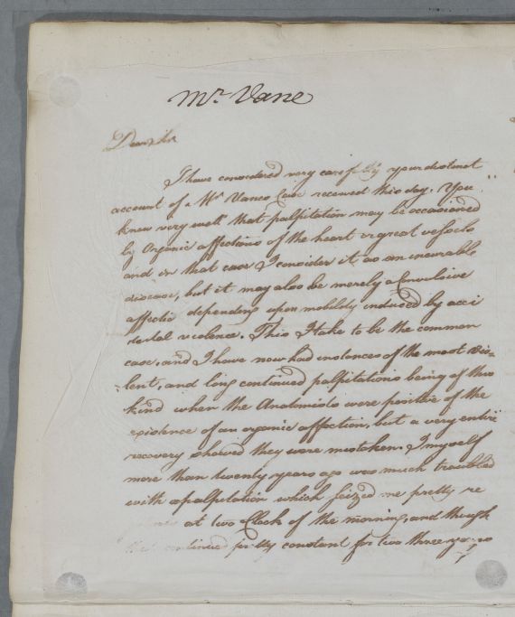 Letter concerning the case of Mr Vane. Reply to letter 2780, and was replied to immediately. Cullen describes how 20 years ago he suffered from palpitations, and continued to do so for two or three years.