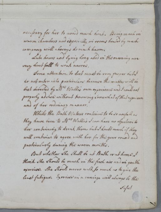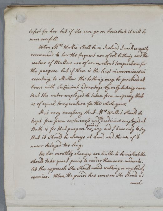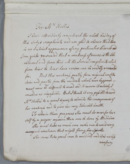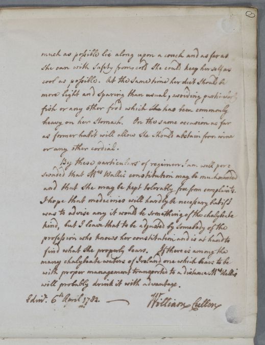 Reply for Mrs Wallis [probably addressed to he husband], in whose complaints Cullen sees 'no distinct appearance of any particular disease'. He suggests a 'weakness of nerves' as the sole ailment, acquired partly from her constitution and partly from 'the accidents which have happened'. He recommends the avoidance of cold and of any activity which 'might flurry her spirits', and when she is in Ireland, the 'frequent use of cold bathing' with the 'waters of Marrow'.