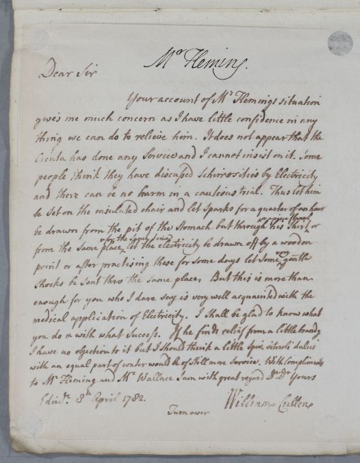 Reply, 'Mr Fleming'. Cullen says that the patient's situation 'gives me much concern as I have little confidence in any thing we can do to relieve him'. He does, however, suggest that 'there can be no harm in a cautious trial' of electricity. He passes on his regards to Mr Fleming and Mr Wallace, and says he is happy to find Mr Mathie recovering.