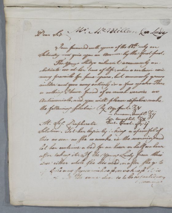 Letter to Mr McMillan concerning the case of his unnamed female patient with a skin ailment, Cullen writes 'I am a little uncertain by what post to send this letter; but have sent it by Cumnock, but shall endeavour to give you notice of it by the Dalmellington Carrier when I can find him', and that he will charge no further fee if McMillan has to consult him again on the case.