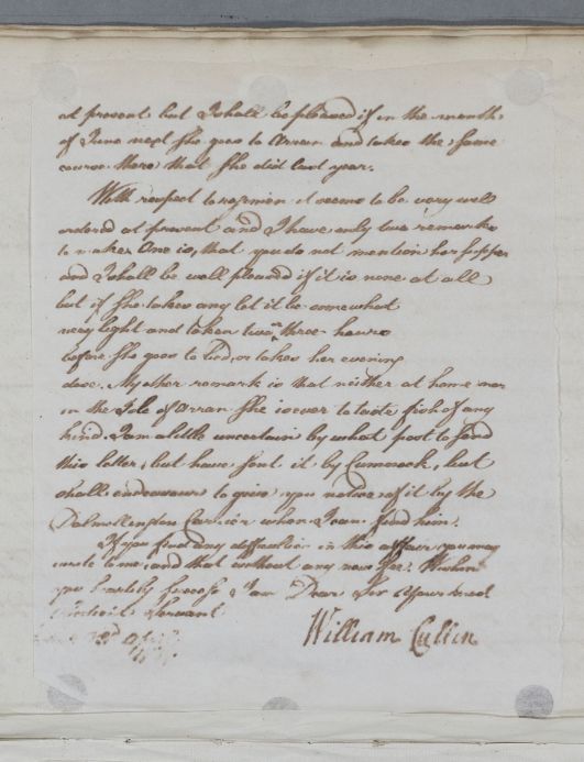 | Summary | Letter to Mr McMillan concerning the case of his unnamed female patient with a skin ailment, Cullen writes 'I am a little uncertain by what post to send this letter; but have sent it by Cumnock, but shall endeavour to give you notice of it by the Dalmellington Carrier when I can find him', and that he will charge no further fee if McMillan has to consult him again on the case. |