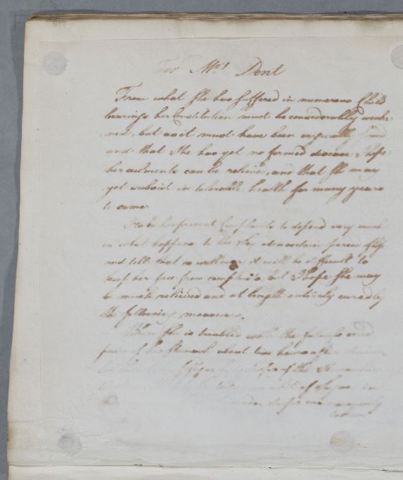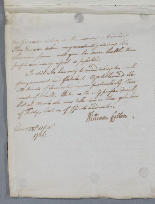 | Summary | Reply headed 'For Mrs Dent'. Advice and laxative prescriptions for Mrs Dent, whose 'Constitution must be considerably weakened' by her 'numerous Child bearings' and whose stomach ailments Cullen believes 'depend very much on what happens to the Sex at a certain period of life' (i.e. are primarily menopausal). He advises against the use of aloetics if she is still menstruating or has piles. The copy is poor in places. |